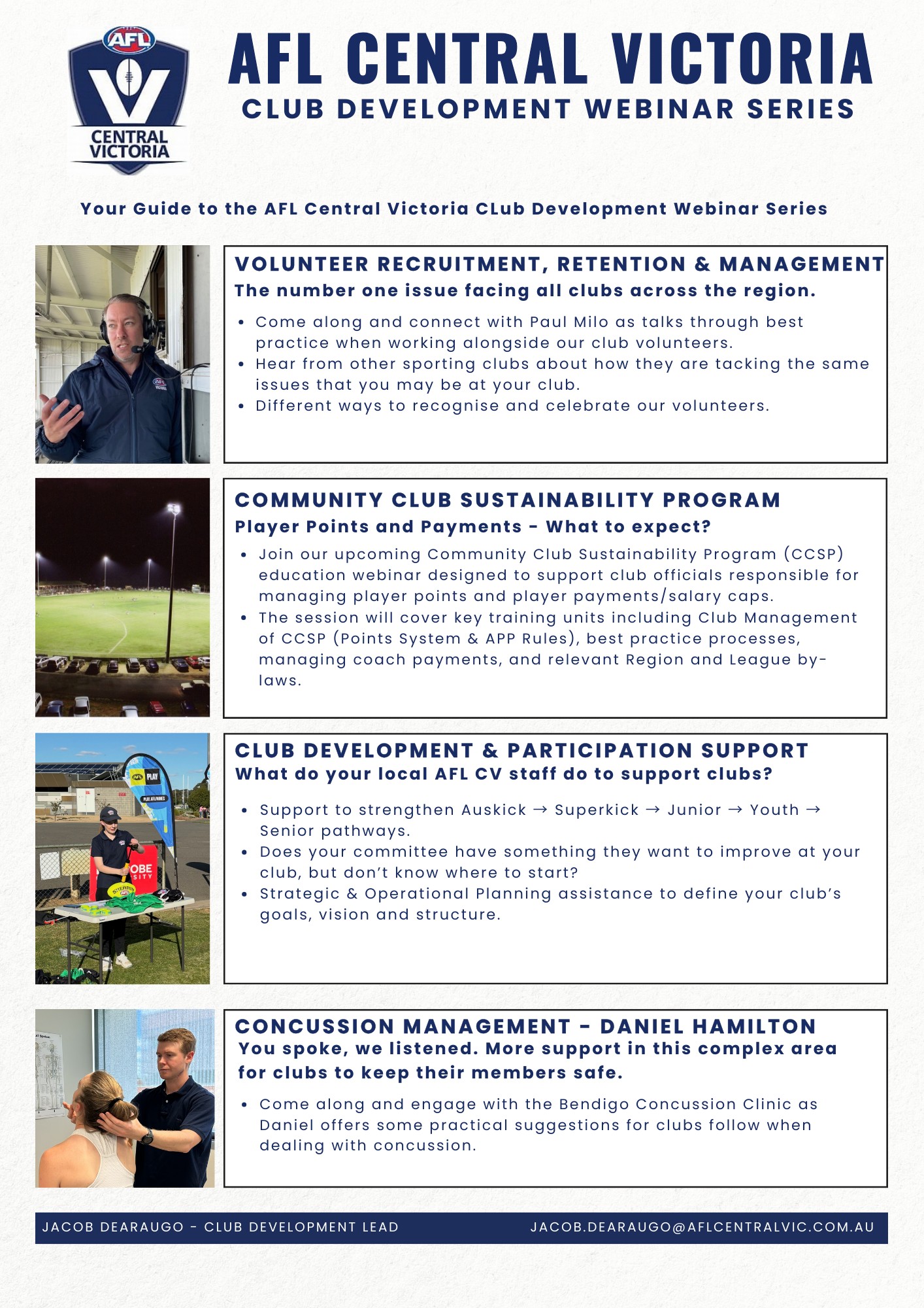 AFL Central Victoria is excited to announce that the registration link is now LIVE for our upcoming Club Development Education Webinar Series which replaces our in-person Club Expo.