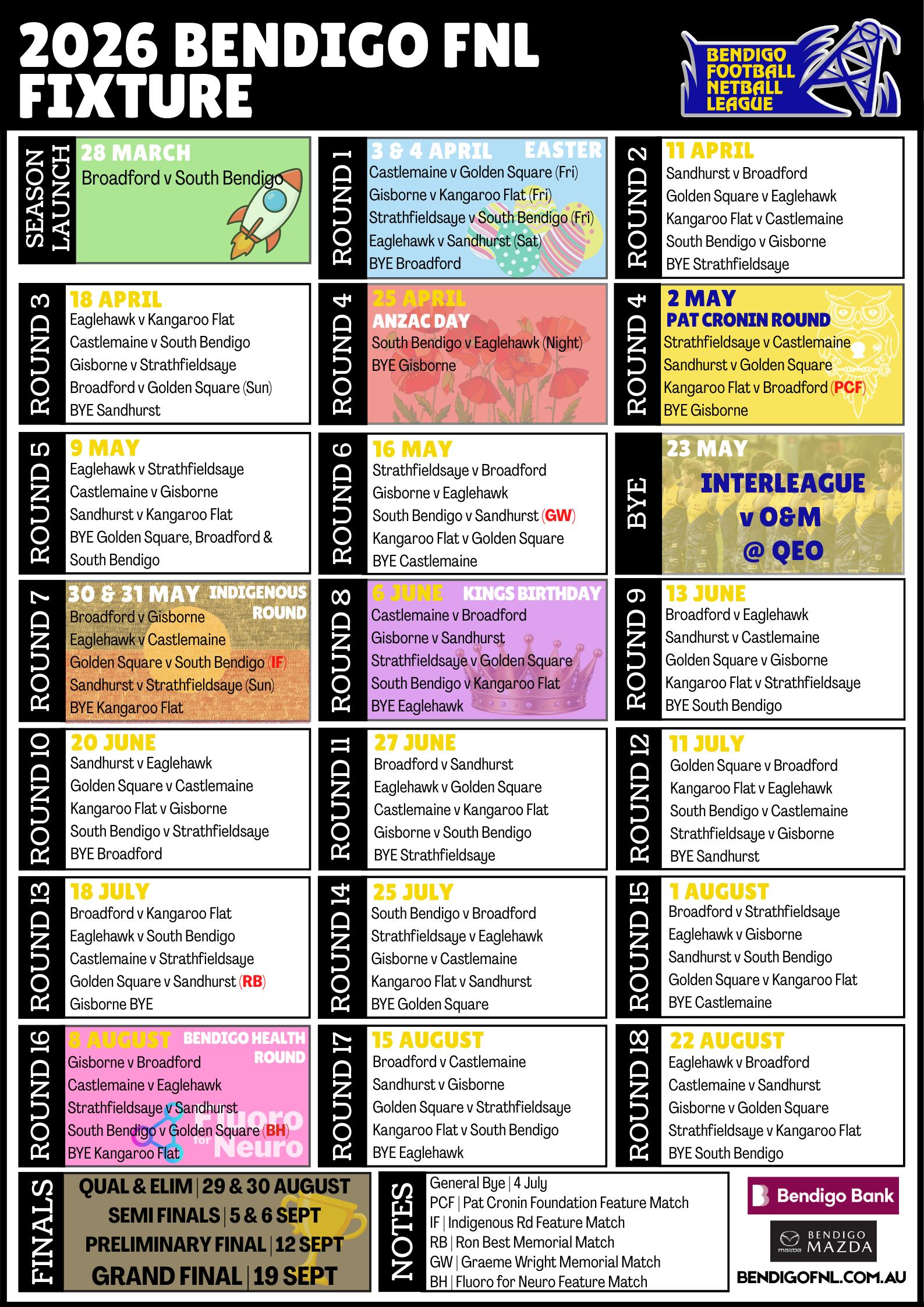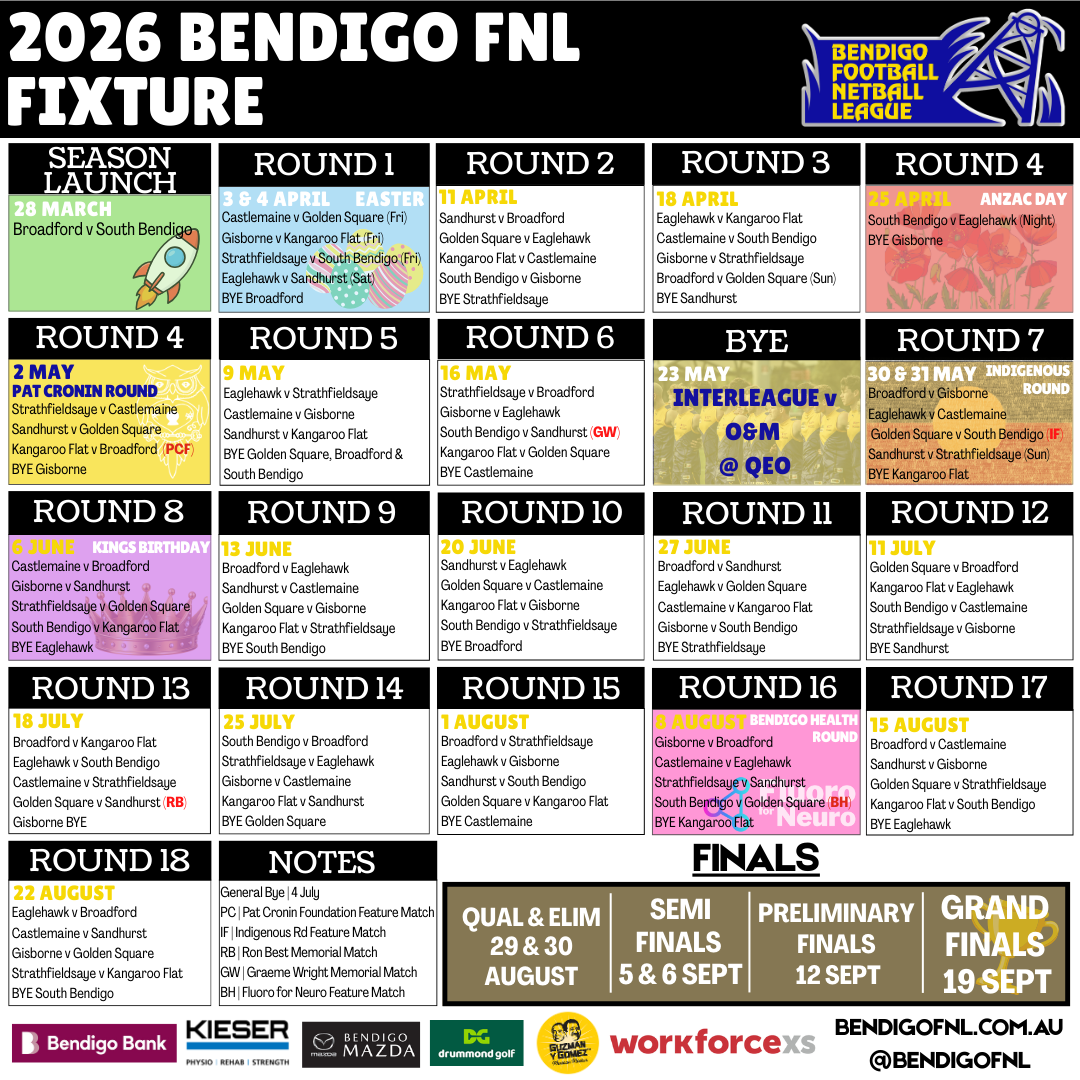 The Bendigo Football Netball League (BFNL) have finalised the 2026 fixture with the season set to commence on 28 March as BFNL newcomers, Broadford FNC host South Bendigo FNC in a standalone feature matchup. While BFNL Grand Final day is scheduled for Saturday 19 September 2026.